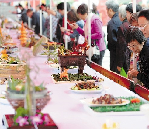 一年一度“中國?臨安百筍宴美食文化節”上,臨安市28家主要餐飲企業為市民獻上一桌桌獨具匠心的筍宴和百余只筍菜,引來眾多食客圍觀。梁臻、張偉星攝