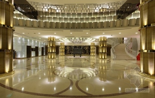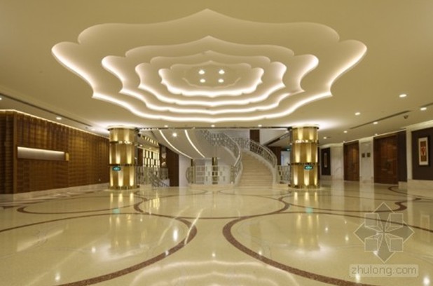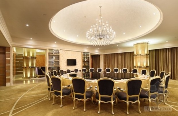 設計師摒棄了傳統高檔餐廳的金碧輝煌,在大廳的設計中將“牡丹”、“祥云”、“浮萍”、“瓦片”等元素運用其中,寄托了對東方文化的無限情感。“牡丹”主要表現在頂面造型之中,在恢弘的空間中增添了優雅的氣質,烘托清雅閑逸的情境!跋樵啤避S然于畫面之上,散發著無限曼妙的意境,富有煙云溟?的意趣,配合地面水波蕩漾的圖案,蜿蜓又悠然自得的神態表現的淋淋盡致,豐富了視覺效果,讓人不禁幻想是徜徉在一望無際的大海之中。中庭的設計將柱子與梁的結構大膽的運用和處理,使空間多了份莊嚴與質樸。傳統房屋中“瓦片”元素的運用更加貼近自然。