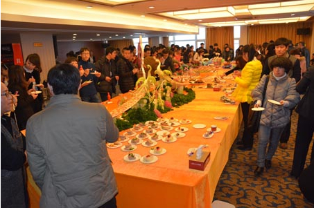 “跨年”野豬盛宴脫離了那種傳統(tǒng)的圓桌模式,以西方宴會(huì)特有的自助形式呈現(xiàn)在眾多美食達(dá)人面前。在一張寬3米、長(zhǎng)15米的大型餐桌上,121道菜品被分成了13個(gè)區(qū)域進(jìn)行擺放。