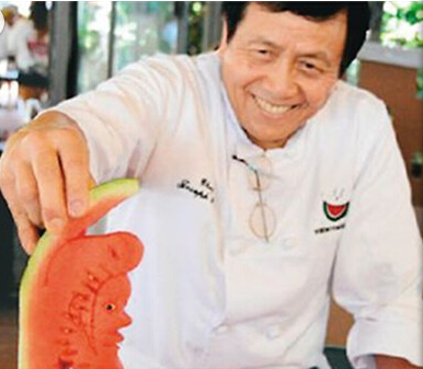 在整個西瓜節(jié)上最引人注目的是雕西瓜活動,廚師們紛紛大展雕工,而華裔廚師潘國強最受注目。兩周前剛剛在一個60萬廚師參加的美國廚師比賽上獲得2014年度廚師稱號的潘國強,是歷史上唯一獲得此獎項的華裔廚師。在他的刀下,各種造型被雕刻得栩栩如生,從熱帶魚到中國龍,從玫瑰花到小兔子,快的時候只用20秒就可以雕出讓人驚嘆的西瓜藝術品。