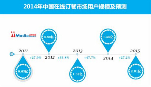 iiMedia Research數據顯示,2013年中國在線訂餐市場用戶規模達到1.07億,預計2014年中國在線訂餐用戶規模將達到1.58億。