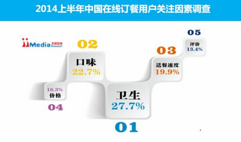 iiMedia Research數據顯示,2014年上半年中國在線訂餐用戶關注因素方面,食物衛生、口味、送餐速度最受用戶關注,占比分別為27.7%、22.7%、19.9%。iiMedia Research分析認為,在線訂餐用戶需求比傳統餐飲消費更復雜和碎片化。