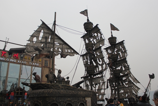 這家火鍋店的負責人告訴記者:“除了火鍋口味保證地道與原汁原味之外,我們玩的就是一個電影噱頭!敝貞c是火鍋的重要發源地,火鍋又包含著重慶的碼頭文化,而電影《加勒比海盜》為觀眾一直熱追,所以設計團隊就決定用加勒比海盜船的模型來布置餐廳場景,并以“坐在船上吃火鍋”為餐廳主題。