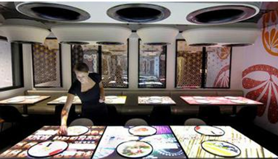烏克蘭一家公司開發了一種叫做交互式餐廳的技術,客人點餐變得完全自助。餐廳把菜品、飲料的照片、具體信息陳列在一個防水觸屏桌上,顧客只需要在電子菜單上下單就可以將信息網傳給廚房。不但可以節約服務員的本錢,還免掉了詢問菜肴情況的繁瑣程序,在這個桌面上可以輕松完成點餐的工作。