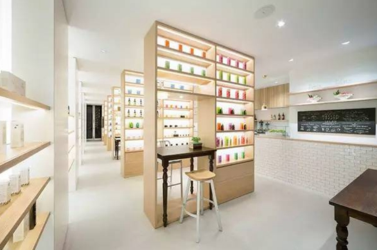 為了最大限度地突出產(chǎn)品本身,整個(gè)空間以白色為主色調(diào),Nendo 設(shè)計(jì)團(tuán)隊(duì)設(shè)計(jì)了很多原木材質(zhì)的擱架單元,從地面架起至天花板,就像是圖書館里的書架似的。書架內(nèi)置了白色透光性極強(qiáng)的發(fā)光裝置,映襯著放置在擱架上包裝色彩繽紛的產(chǎn)品,給人自然、溫暖的觀感。