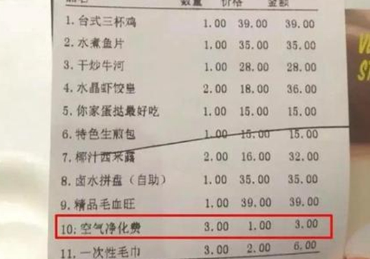 原來,該餐廳為優(yōu)化用餐環(huán)境,購置了空氣凈化器凈化餐廳空氣。為彌補設(shè)備及運營費用,便自作主張在餐費之外加收每位1元的“空氣凈化費”。