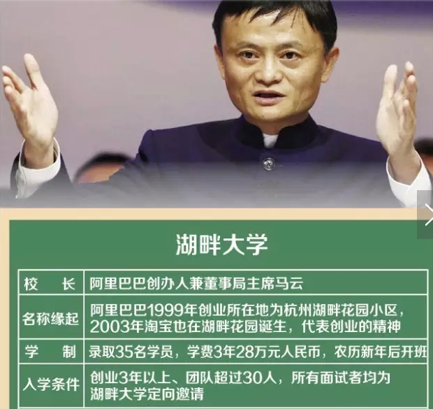 [摘要] 2015年1月26日,馬云和聯想控股董事長柳傳志、復星集團董事長郭廣昌、萬通控股董事長馮侖、巨人網絡董事長史玉柱等9名企業家和學者共同在杭州創建湖畔大學。