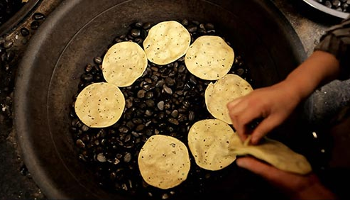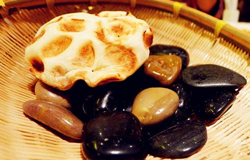石子饃具有明顯的石器時代“石烹”遺風(fēng),唐代亦稱“石鏊餅”因其是將餅坯放在燒熱的石子上烙制故而得名,又稱砂子饃。石子饃其歷史源遠(yuǎn)流長,各地都有,晉陜及中原地區(qū)非常流行,石子饃主要原料是面粉、調(diào)味料和動植物油,石子饃的餅胚放在一鍋又黑又圓的石子上面,烤出來的面餅外觀焦黃鮮亮,中凹邊突,咬開后層次分明,外酥內(nèi)軟。石烙工藝講究傳熱均勻,火力不能太小或太大。太小則無焦香味,更無酥脆的質(zhì)感,太大則外焦而內(nèi)不熟,對成品外型也會有很大影響。由于石頭本身是熱的良導(dǎo)體,傳熱均勻迅速,使烹調(diào)時間得以有效地縮短。在生產(chǎn)資料極端匱乏的古代,采用石烹技法是個聰明又健康的方法。