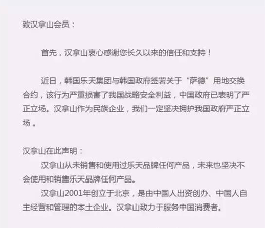 8日晚間,餐飲企業漢拿山在其微信公眾號中發布澄清聲明表示:漢拿山于2001年創立于北京,是由中國人出資創辦,中國人自主經營和管理的本土企業。“我們是百分百中資企業。未使用和銷售過樂天的產品,未來也堅決不會使用。”