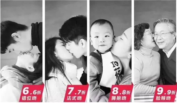 “西貝”為“親嘴打折節”準備了一個極其吸引眼球的廣告語“吻得越深,折扣越大”,并設計了四種不同的親吻姿勢和對應折扣。別出心裁的打折方式,給了中國人一次公開高調秀恩愛的機會!