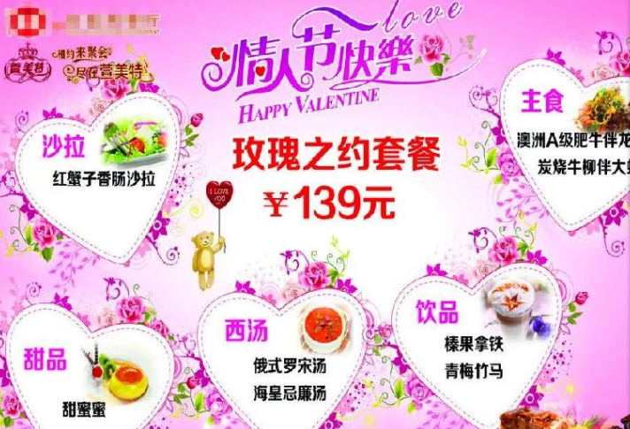 這是高檔西餐廳的普遍做法:情人節當天只提供情人節超值菜單,并只接受預定。