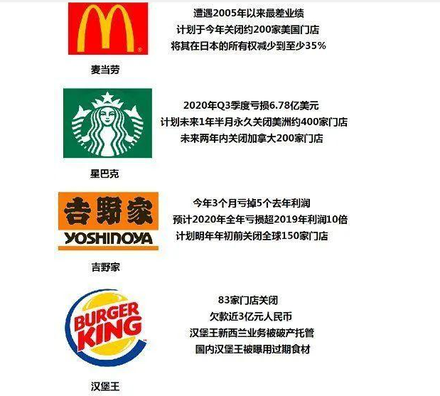 在新冠疫情的影響下,不只是吉野家關(guān)店自救,麥當(dāng)勞關(guān)店200家,星巴克關(guān)店400家……為應(yīng)對(duì)危機(jī),曾經(jīng)在全球“開(kāi)疆拓土”的國(guó)際餐飲知名品牌紛紛關(guān)店。
